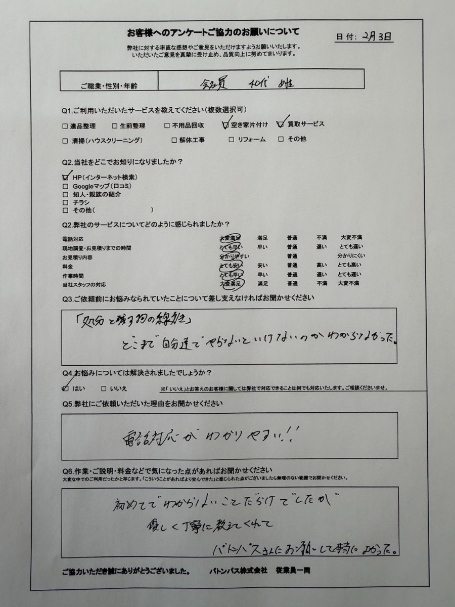 遺品整理や空き家整理は何度も経験される方は少なく、体力面や精神面にも負担がございます。当店スタッフがお客様一人ひとりに寄り添い、親身になって作業を行います。